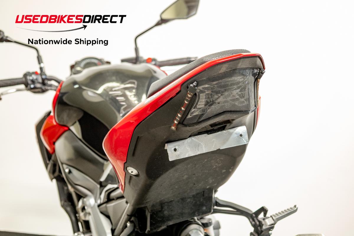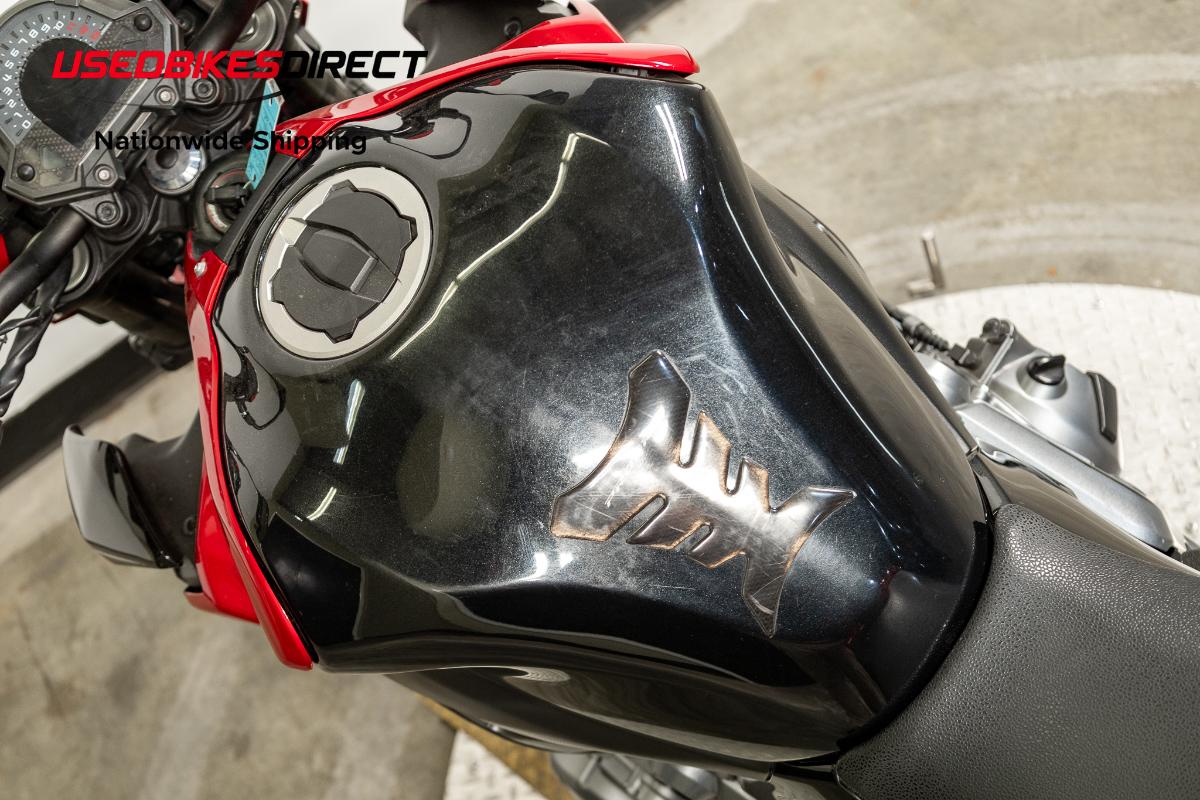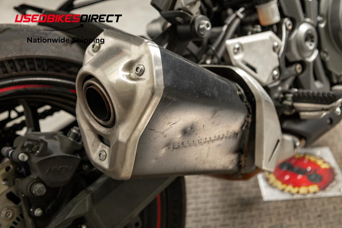 Clutch lever bent, bar end scraped, exhaust dented, rear seat torn, scratches present throughout.