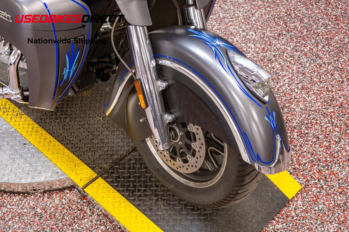 Custom paint / pinstriping that has some small imperfections. Chrome trim on front fender is peeling.